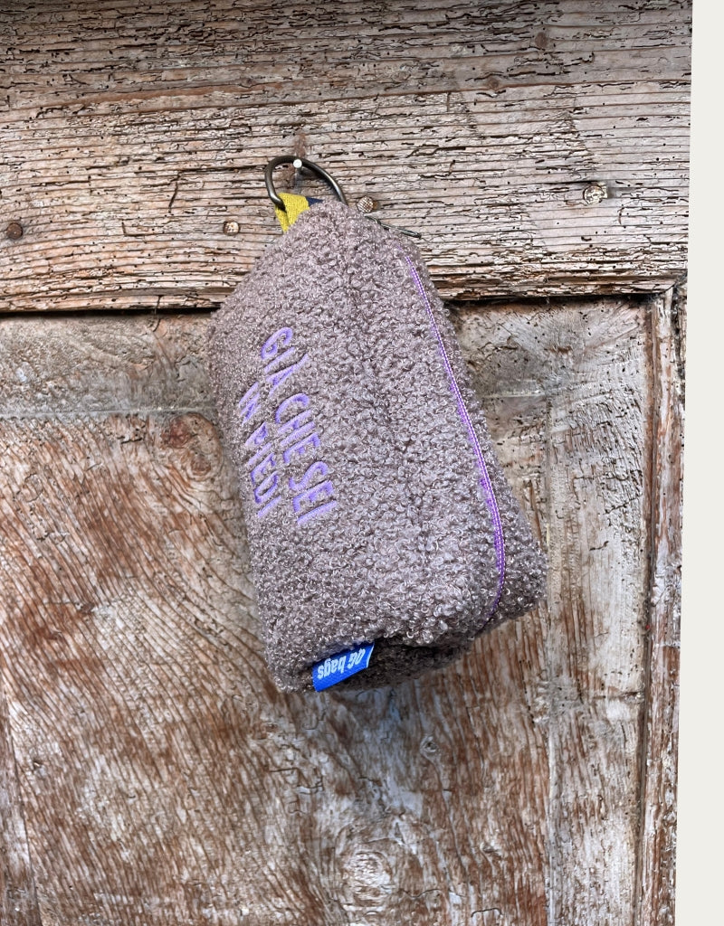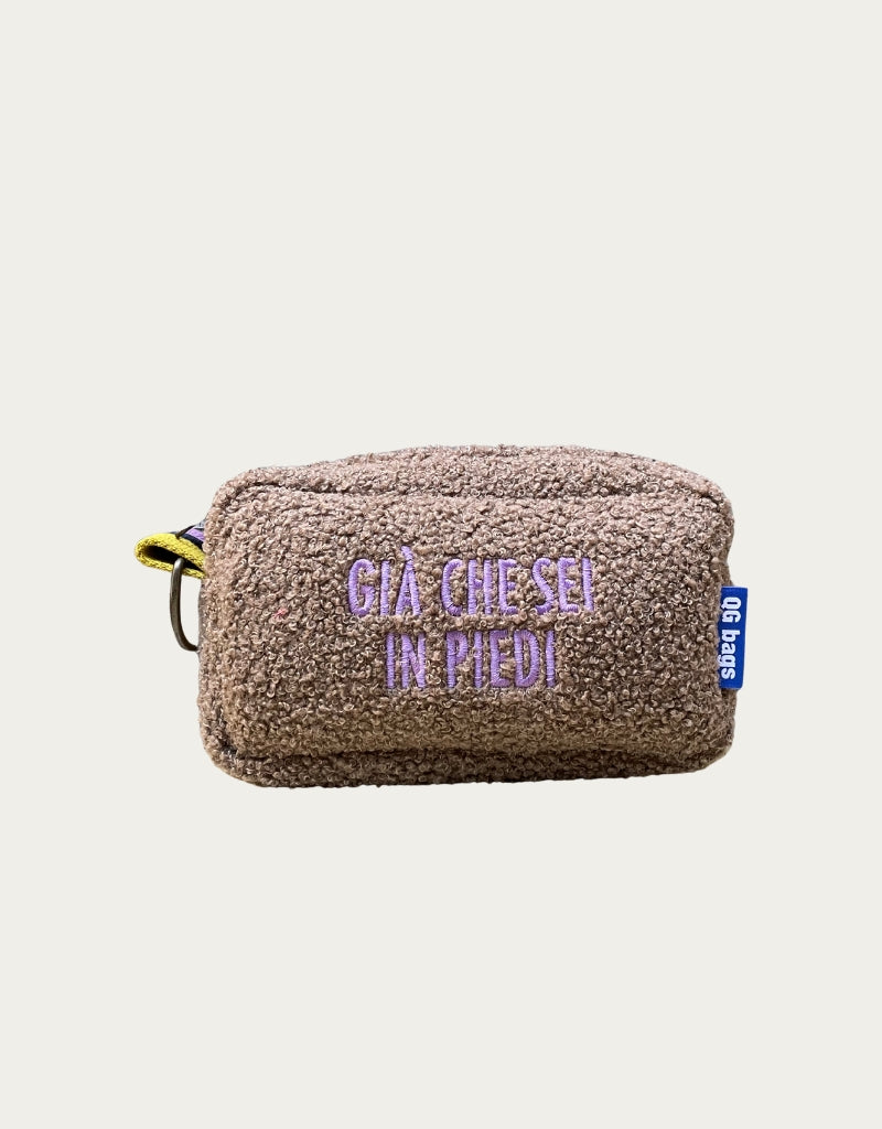 Pelosino castoro + cerniera lilla, scritta "GIA' CHE SEI IN PIEDI"