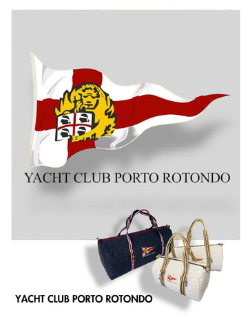 collezione esclusiva QGbags per Yacht Club Porto Rotondo. Travel e City Bag in cotone blu o bianco con nastri per manici con dettagli rossi o beige, ricamo bandiera e logo del club. Equipaggiamento per i soci del club e in vendita nella boutique di Porto Rotondo