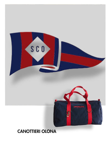 collezione esclusiva QGbags per Canottieri Olona Milano. City Bag cotone pesante blu, nastri per manici rossi e ricamo logo del club rosso. Disponibile per i soci o nello shop del circolo