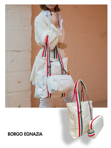 collezione esclusiva QGbags per Borgo Egnazia, 100%cotone bianco, nastri per manici tricolori e ricamo "nowhere else" il motto del resort.