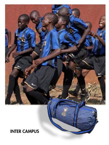 collezione speciale QGbags per INTER CAMPUS, Travel Bag in jeans blu scuro con nastri per manici nerazzurri. ricamo logo istituzionale. Equipaggiamento per i volontari nel campus in Africa