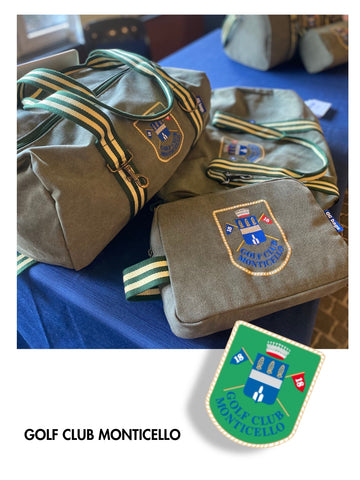 collezione esclusiva QGbags per Golf Club Monticello. Set di prodotti QGbags in cotone verde militare con manici e dettagli verde scuro e panna. Personalizzazione col logo deel club ricamato. Disponibile per soci e ospiti del club nella Club House