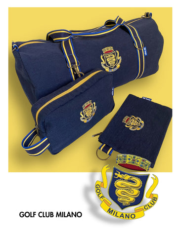 collezione esclusiva QGbags per Golf Club Milano. Travel Bag, Beauty porta palline e pochette porta documenti in cotone blu con nastro blu, bluette e giallo creato appositamente con i colori del club. Personalizzazione con ricamo stemma del club. Disponibili presso lo shop del golf.