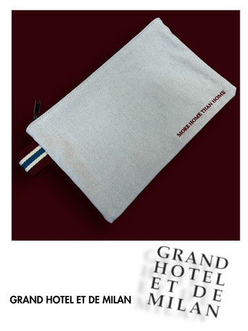 collezione esclusiva QGbags per GRAND HOTEL et de MILAN, tradizionale pochette in cotone panna con dettagli ottanio e bordeaux, ricamo motto dell'hotel "MORE HOME THAN HOME". Disponibile per gli ospiti dell'esclusivo albergo milanese