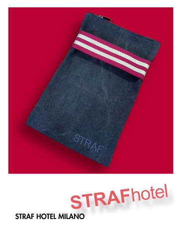 collezione esclusiva QGbags per STRAF HOTEL MILANO, pochette speciale in cotone grigio scuro con nastro per manico impugnatura rosso scuro e panna, logo dell'hotel ricamato tono su tono. Disponibile presso la boutique dell'hotel